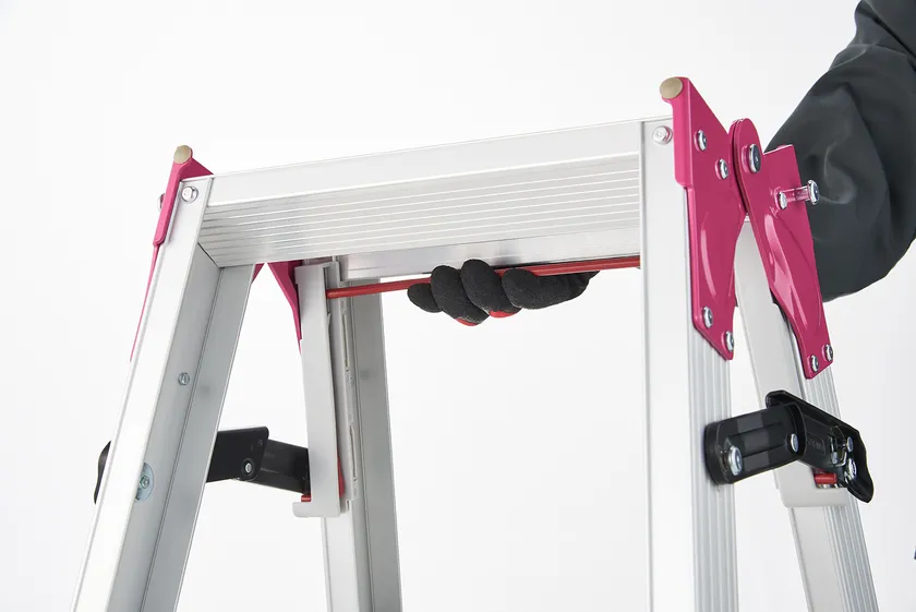 従来のはしご兼用脚立は、閉じる際に、両手で左右のロックを解除、折りたたむという 動作がありました。当製品は、片手でワンタッチバーを持ち上げるだけで、ロックを解除し脚部が閉じるため、作業効率を高めることができます。