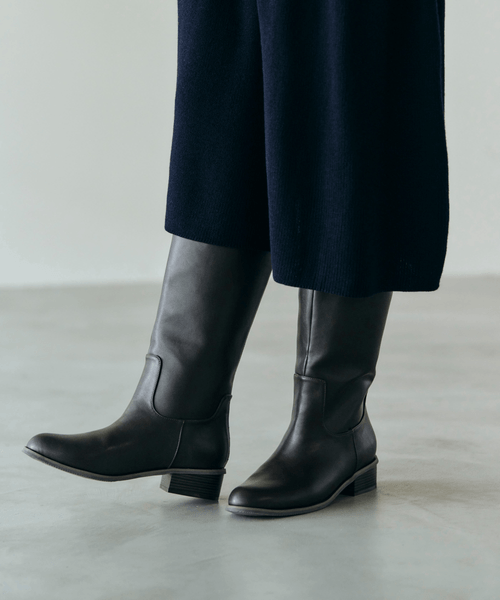 すっきりとしたキレイめデザインのロングジョッキーブーツは、細身なシルエットながらブーツインも可能なサイズ感。