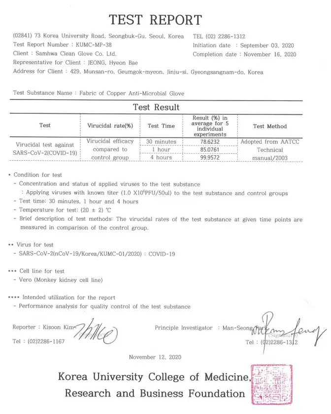 ■韓国 高麗大学医科大学生物安全センターから実験済み!銅イオン繊維の銅手袋!