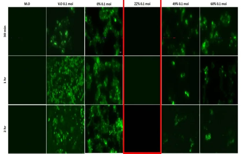 sars-cov2に対する銅の抗ウイルス効果をひと目でわかりやすく観測するために間接蛍光抗体分析を行った。0.1moiのSARS-CoV2に感染したベロ細胞単層を異なる割合の銅に出した後、80%の冷却アセトンに30分間固定した。その細胞を一次抗体(SARS-CoV2Sタンパク質)に加えて、4℃で一晩培養した。FITC標識の二次抗体で細胞を暗闇の中で加えて、37℃で1時間培養した。その結果、蛍光がライカ製蛍光顕微鏡で観察された。