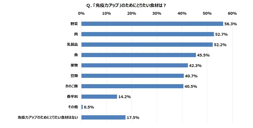 免疫力アップのためにとても重要な「食」に関して、免疫力アップのためにとりたい食材をお聞きしました。その結果1位は「野菜」56.3%で、2位「肉」52.7%、3位「乳製品」52.2%と続きました。「香辛料」14.2%を除いたすべての選択肢の回答割合が4割を超えており、免疫力アップのために様々な食材をバランスよくとりたいと考えていることがうかがえます。