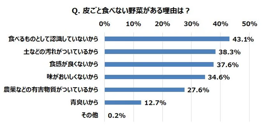 前問でいずれかの野菜について「皮ごと食べることはほぼない」、「皮ごと食べたことは一度もない」と回答した方に、皮ごと食べない理由を聞いたところ「食べるものとして認識していないから」43.1%が最多となりました。野菜の皮は捨てるものと思っている方が多いようです。からだの免疫力を上げる「ファイトケミカル」は野菜の皮にも多く含まれています。ウイルス対策にも効果的と知ると、野菜の皮の印象が変わるのではないでしょうか。