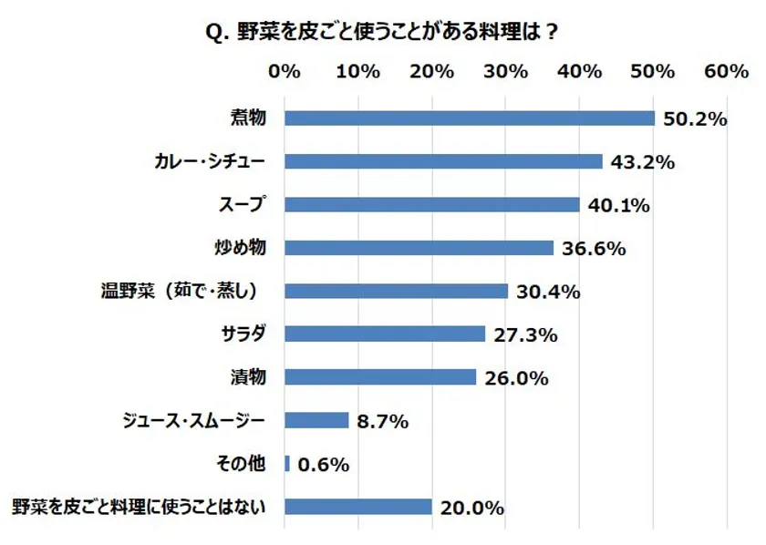 年に1回以上料理をする方に、野菜を皮ごと使うことのある料理をお聞きしました。1位「煮物」50.2%、2位「カレー・シチュー」43.2%、3位「スープ」40.1%と、冬の定番料理が上位となりました。