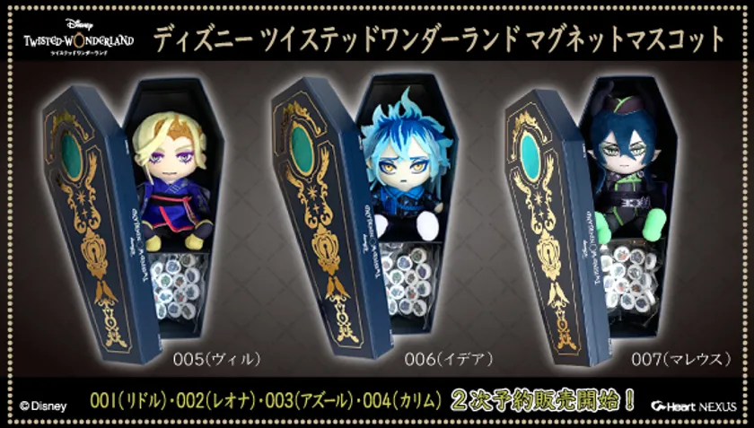 同時に今までに予約販売が終了した、「ディズニー ツイステッドワンダーランド マグネットマスコット」001(リドル)、002(レオナ)、003(アズール)、004(カリム)(各3,960円 税込/送料・手数料別途)の2次予約販売を行います。
