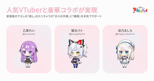 アプリリリースにともない、コラボレーションが実現したのは、日本国内外で高い人気を誇るVTuber「乙夏れい」、「猫元パト」、「凪乃ましろ」の3名。それぞれが数万人規模のファンコミュニティを抱えており、YouTube・Xを中心に精力的に活動しています。