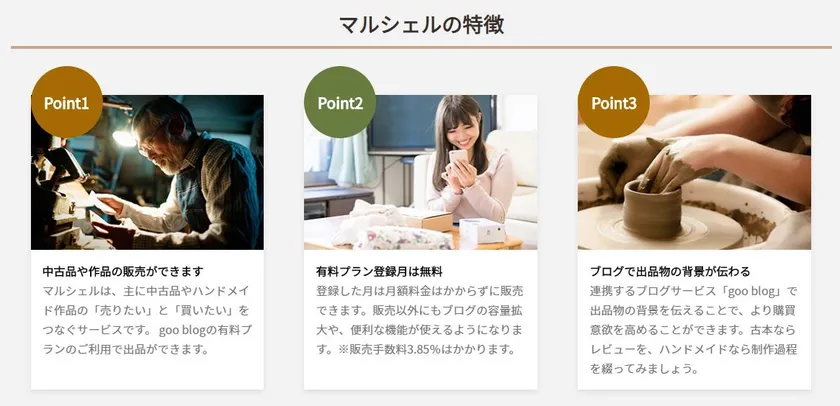 また「マルシェル Marchel」は、goo blogの無料プラン若しくは有料プランにご契約いただけると、出品やブログの発信ができるようなシステムとなっております。