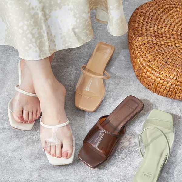 クリア素材で涼しげな足元に。パイピングクリア スライドサンダル