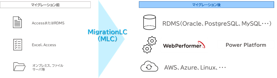 「MigrationLC(MLC)」は、ExcelやAccessを基盤とする業務システムの運用課題に対して、ローコード技術を活用したマイグレーション・モダナイゼーションにより、業務プロセスの標準化、システムメンテナンス性の向上、運用コストの最適化、データ管理の統合化、WEB化・クラウド化の推進など、業種・業態を問わず幅広いお客さまへ包括的な解決策・メリットを提供します。