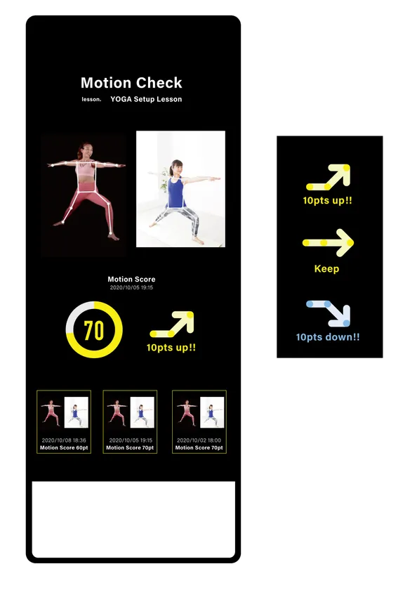 今後のFitness Mirrorの機能開発についてご案内いたします。現在、2021年春頃の実装を目標に、“AIを活用したレッスン効果測定”機能の開発を進めております。本機能は、ユーザー様の運動状況を製品本体のHDカメラで補足、解析・データ化し、元のレッスンプログラムとのマッチング度合いをAIにてスコアリングする機能で、ユーザー様の自宅トレーニングの効果測定を得られるものです。これにより、トレーナーを介したフィードバックがなくとも、ご自身のやっているトレーニングが正しく行われているのかの評価を得ることができるようになります。