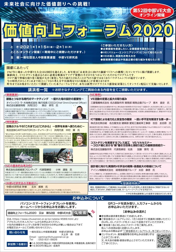 価値向上フォーラム2020「第52回中部VE大会」をオンラインにて 1月15日~2月1日に開催 未来社会に向けた価値創りへの挑戦