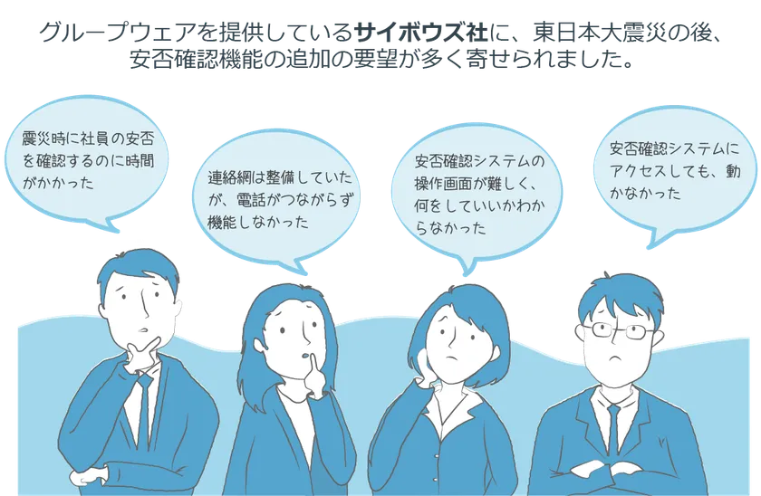 その直後から企業向けのグループウェアを開発するサイボウズ社に「電話がまったく繋がらなかった」「他社の安否確認システムを利用しているが動かなかった」との理由から、グループウェアに安否確認機能を付加してほしいとの要望が多くありました。
