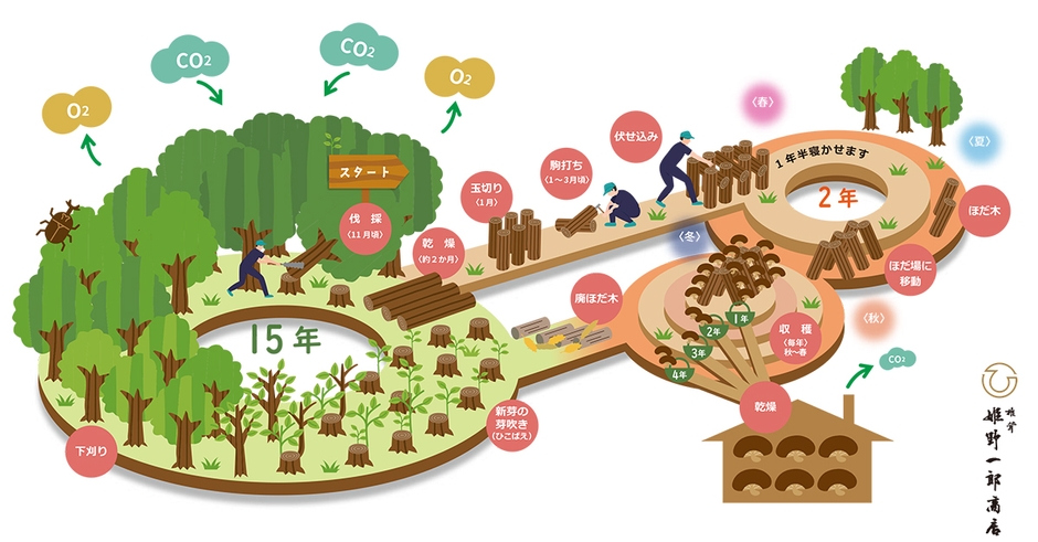 原木になるクヌギの木は森の中で育ち、二酸化炭素を吸収して、地球の温暖化防止に貢献しているのです。