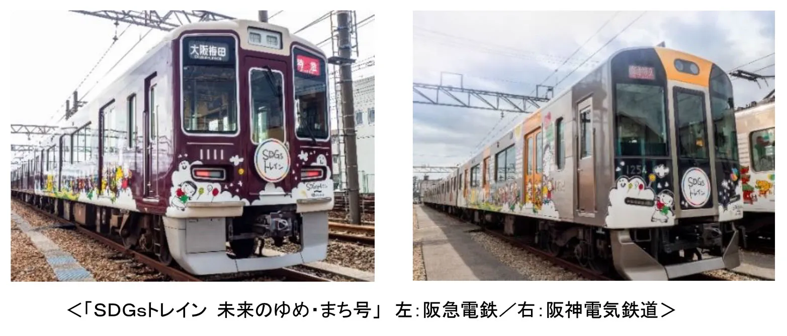 阪急電鉄と阪神電気鉄道で2019年5月から運行している「SDGsトレイン 未来のゆめ・まち号」では、列車の車体に施すラッピングや車内に掲出するポスター、ステッカー等をすべてSDGsに関連するものにしており、SDGsの認知度の向上に努めることで、SDGsをテーマにしたさまざまな活動を広く社会に普及させ、持続可能な未来を創造するきっかけとなることを目指しています。