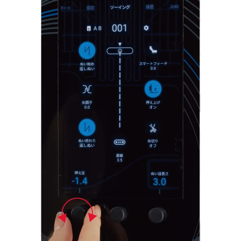手元のジョグダイヤルで押え圧や押え高さの即時変更が可能。