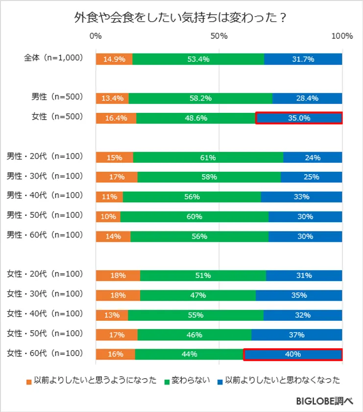 「外食や会食をしたい気持ちは以前と比べてどのように変化したか」と質問したところ、全ての性別・年代で「以前よりしたいと思わなくなった」との回答が「以前よりしたいと思うようになった」を上回った。男女別で見ると、「以前よりしたいと思わなくなった」と回答した割合が男性28.4%に対して女性は35.0%となり、女性の方が外食したいという気持ちが消極的になっている。特に60代女性は40%が「以前よりしたいと思わなくなった」と回答した。