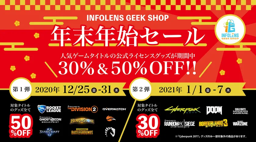 「INFOLENS GEEK SHOP」は、今年9月のオープン以来多くのゲームファンの方々よりご支持をいただいております。そこで、日頃のご愛顧に感謝の気持ちを込めて最大50%オフの年末年始のセールを開催いたします!年末年始、ゲーム三昧で過ごすならさらに気分を盛り上げるゲームグッズもお手元にいかがですか?