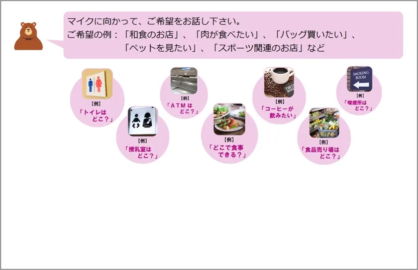 (1)休日の繁忙時など、インフォメーションカウンターにお客様が並ぶようなとき、新AIインフォメーションシステムでお問合せ対応を行うことにより、お客様の待ち時間の短縮とインフォメーションスタッフの対応負担の軽減を図ります。
