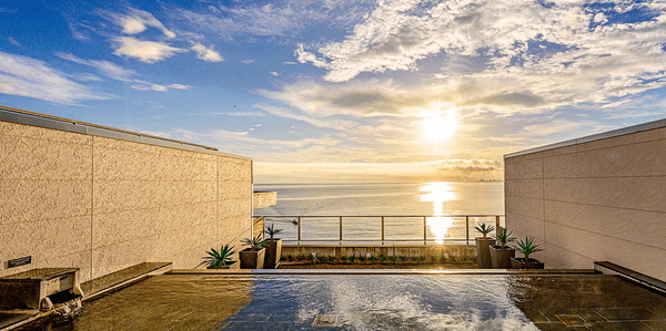 別府湾を望む展望露天風呂。夜は対岸の夜景や頭上に広がる星空を、そして朝は水平線から昇る朝日を眺めるながらの絶景温泉体験をお楽しみいただけます。