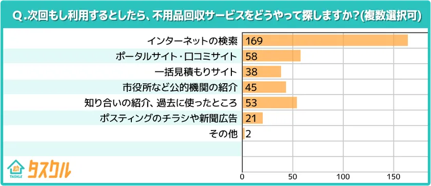毎日の暮らしの些細な悩みを解決する、生活密着情報Webサイト「タスクル」では、家庭の不用品処分に関する課題について注目しており、不用品回収のサービス内容やおすすめ事業者の紹介を行っています。今回は、不用品回収サービスを利用した経験のある人を対象に、利用したプラン、次回の探し方、口コミを参考にするか、などの実態調査を行いました。