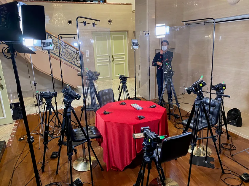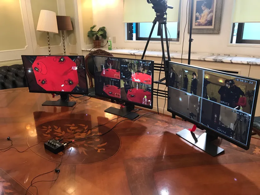 ▲この日のために用意した10台のカメラを駆使した撮影システムで、表情、手元、頭上からとさまざまな角度から狙います。またゲームマスター&ディーラーは別室のモニタールームでカメラの映像を見ながら解説&ツッコミを入れていきます。