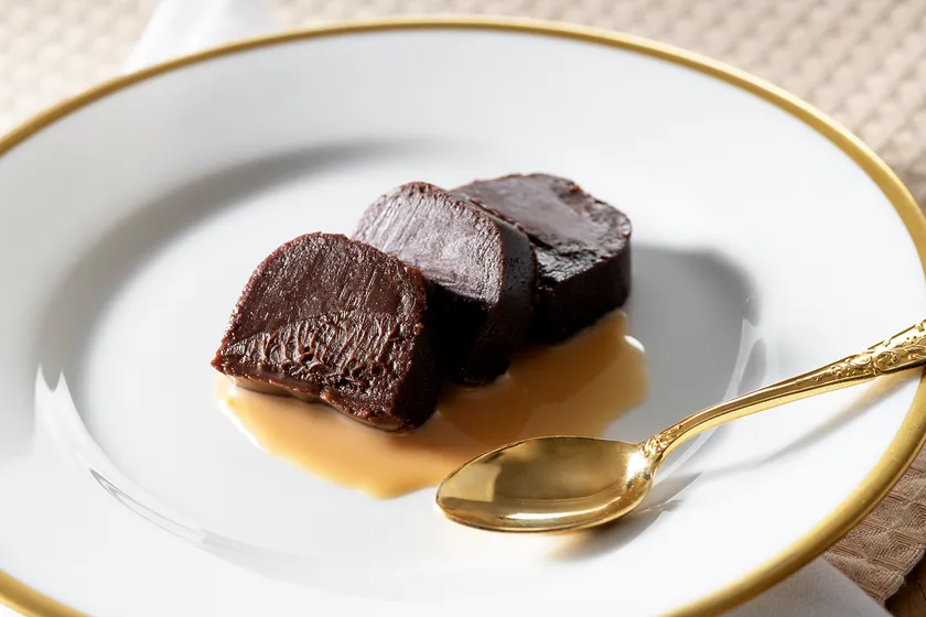 カカオの産地にこだわり、製造時の気温や湿度など徹底された管理の中で創り上げられた、クセのない素直な甘さと上品な味わいのテリーヌは、濃厚なカカオの風味とねっとりとした食感を楽しめます。また、別添のプラリネソースをかけると、ナッツの香ばしさがプラスされて、さらにリッチな味をお楽しみ頂けます。口の中にすーっと広がる雑味のないなめらかな口当たりも特長です。