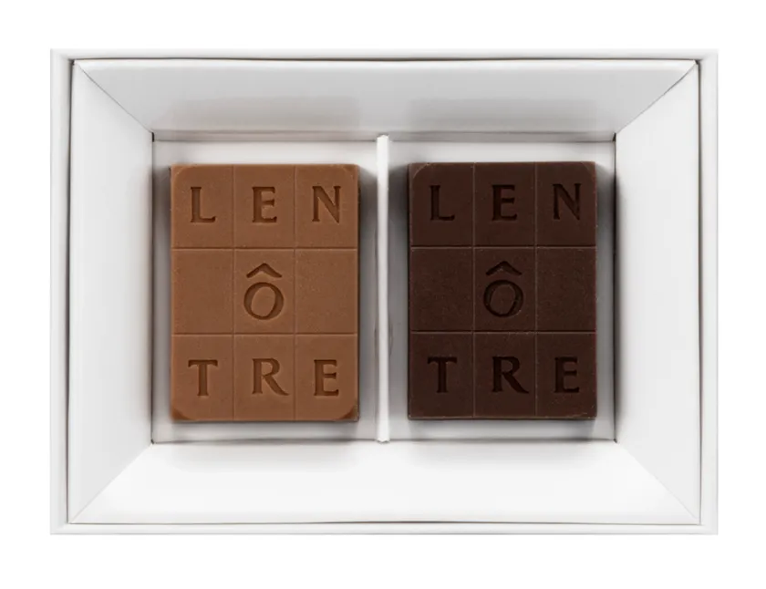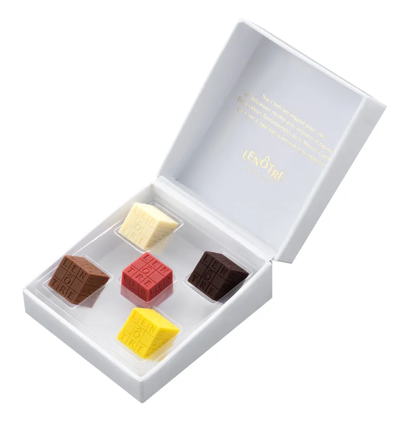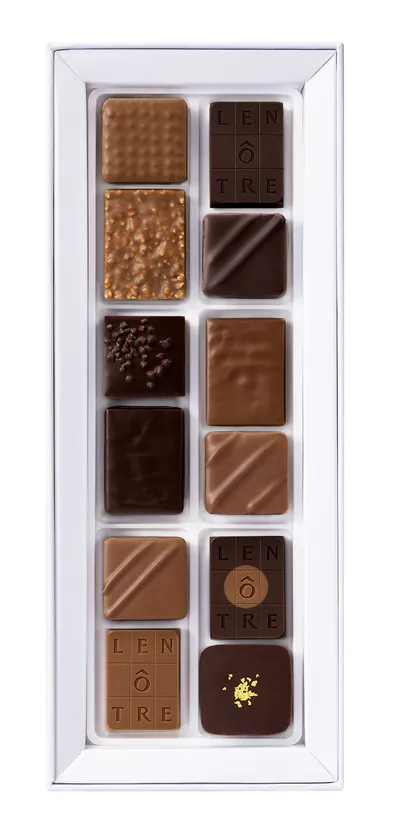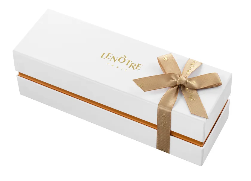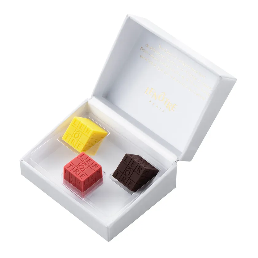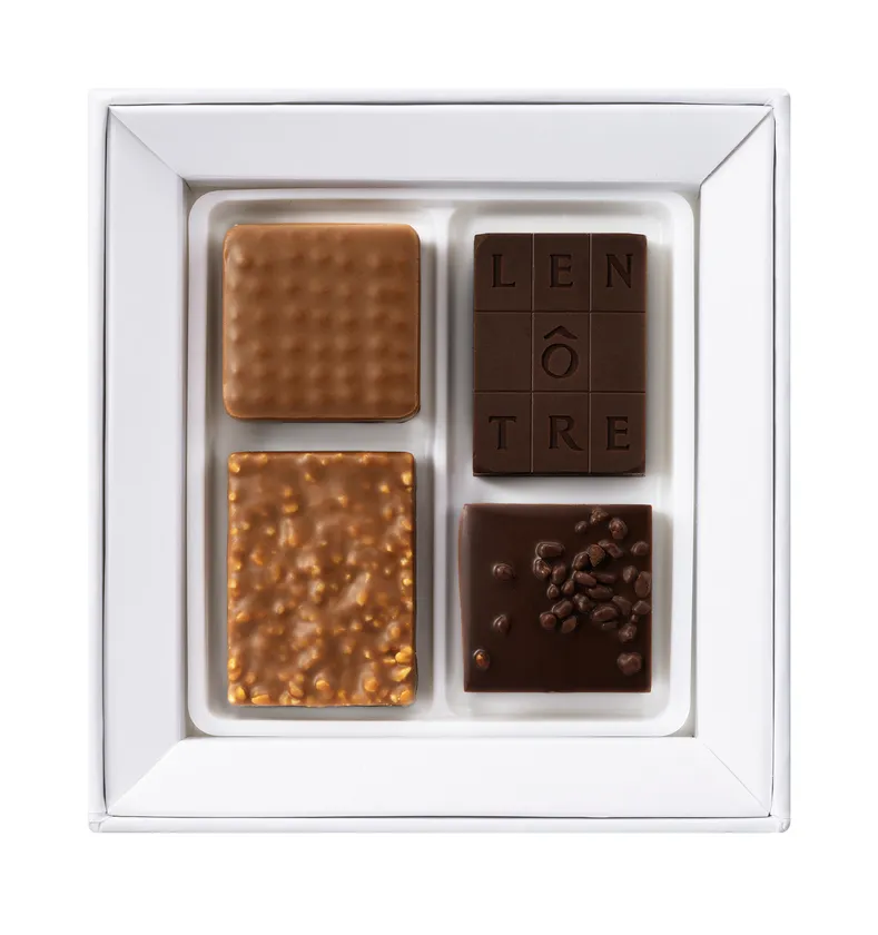 2019年フランスで発売したクリスマス商品の素材の組み合わせから出来上がった新たなチョコレートです。ローストしたヘーゼルナッツと松の実のプラリネをビターチョコレートでコーティング。松の実はヨーロッパでは古くからお菓子に多く使われますが、プラリネでは珍しく、<ルノートル>の新たな発見が作り出したおいしさです。