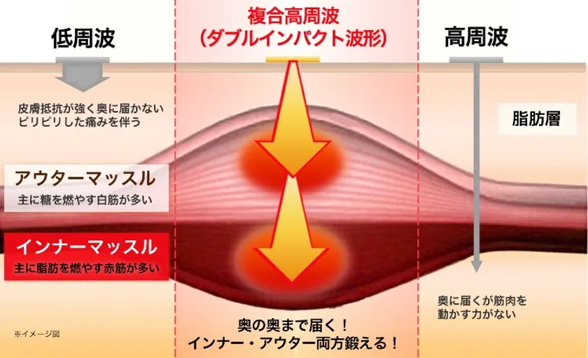 『エクスケアDi』は、従来のEMS機器では難しかったインナーマッスル(深層筋)とアウターマッスル(表層筋)を同時にトレーニングできる、日米特許取得済みの複合高周波EMS機器(※2)です。