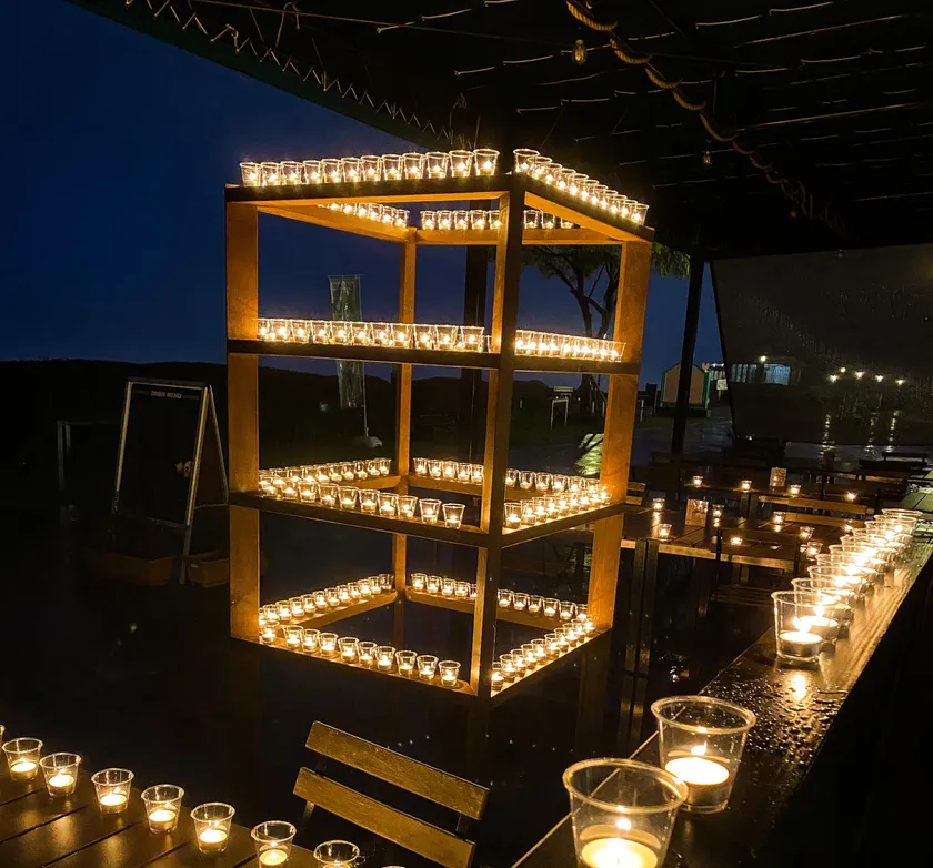 休日をスノーリゾートで過ごすお客様に少しでも安らぎと癒しを与えられれば、の想いで2020年12月29日の16:30より、台に積まれた約300個のキャンドルが点灯。