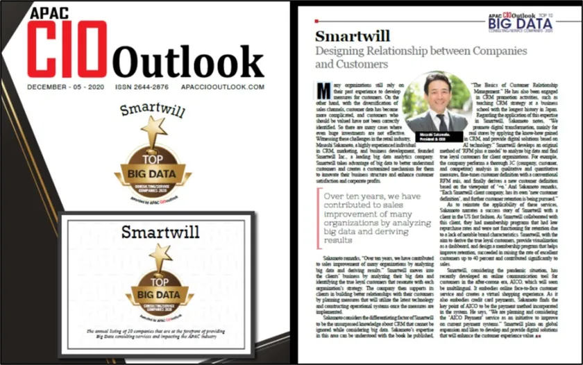 『APAC CIO outlook』は、米国シリコンバレーに本部を置く雑誌で、アジア太平洋地域のCIO、CTOなどに向け、ITコミュニティと様々な情報を提供することを目的に発行されています。同誌にて、弊社のビッグデータを活用したCRMコンサルティングにおける革新性、企業貢献が高く評価され、2020年TOP10の1社として選出されました。選出に伴い、弊社代表取締役 坂本 雅志のインタビュー記事が掲載されました。