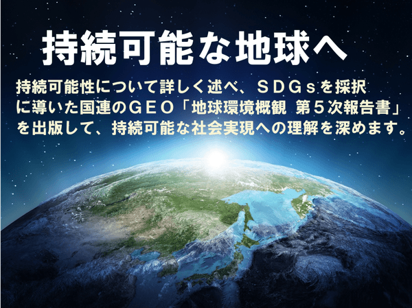 事業内容: 国連環境計画の最重要報告書であるGEO-5「地球環境概観第5次報告書」を翻訳して、限界点を超える危機的状況にある地球環境の現状(上巻)とその対策(下巻)について、ウェブ上で公開すると共に、本(現在は上巻のみ)を出版して皆様に伝えています。