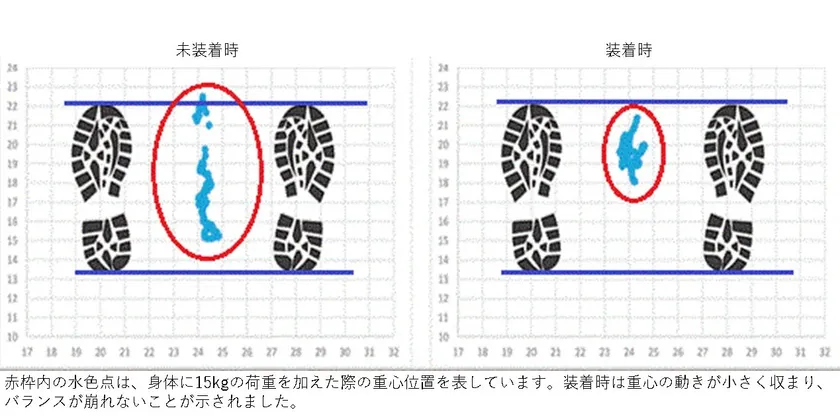 斜め前方に15キロの荷重を加えた際の重心・体幹動揺範囲を示したのが図1です。範囲が狭いほど安定していることを示します。製品使用時には、動揺範囲が半分程度まで縮小し、体幹が安定していることがわかります。つまずき時の転倒リスク軽減や、立ち仕事、歩き仕事の疲労軽減につながる効果です。