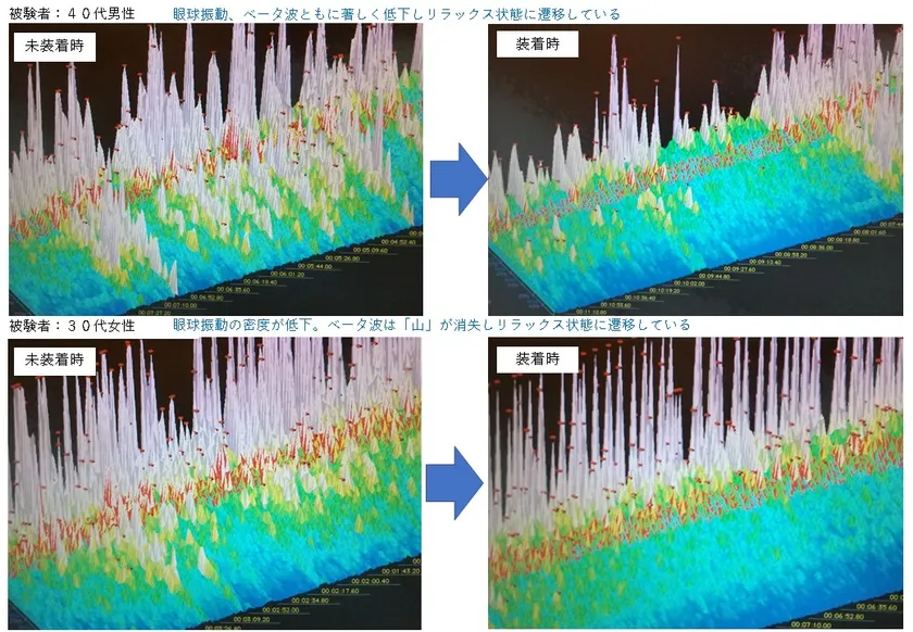 図3は脳波を3Dで表したもので、中央の赤線から右が未装着時、左が装着時です。ストレスを表すピンクの山が小さくなり、リラックス状態に変化しています。