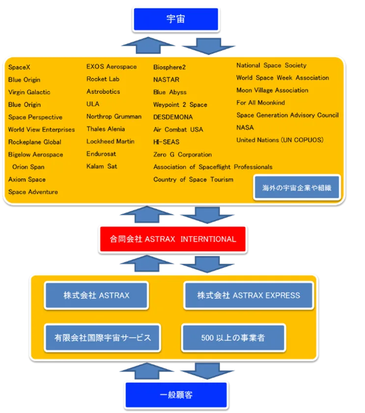 当社は、民間宇宙サービス事業体ASTRAXグループの一員として、海外の宇宙インフラ(有人宇宙船やロケット、人工衛星などの宇宙機や、地上の宇宙関連施設(訓練施設や研究施設など)、国際会議や国際シンポジウム、国連の宇宙関連会議など)と日本の民間宇宙サービス関連企業をつなぎ、スケジュール調整、交渉や調整、人脈紹介や契約作業、手配や登録作業などをサポート、代行(仲介)する事業(サービス)を行っております。