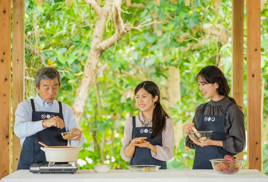 収穫した竹富芋で、昔ながらの芋のお菓子「ンヌイ(芋の団子)」や「ビルロー(芋くず餅)」を島民と一緒に作ります。お菓子作りの場所は、自然に囲まれたダイニングです。「ンヌイ」は、芋のピュレと上新粉を手で混ぜ合わせながら、粉気がなくなるまでこねて作ります。昔、島民は、握り飯の代わりに持ち運んでいました。「ビルロー」は、鍋に芋くずと水を入れて火にかけ、芋くずが溶けたら黒糖を加えます。沸騰直前で火を弱め、しっかりと混ぜて完成です。つるりとした舌ざわりで、体調が優れない時にも食べやすく重宝されていました。芋が主食だったころに創意工夫を凝らして生活していた話や、芋をはじめとする島の食文化の話を島民から聞くこともできます。