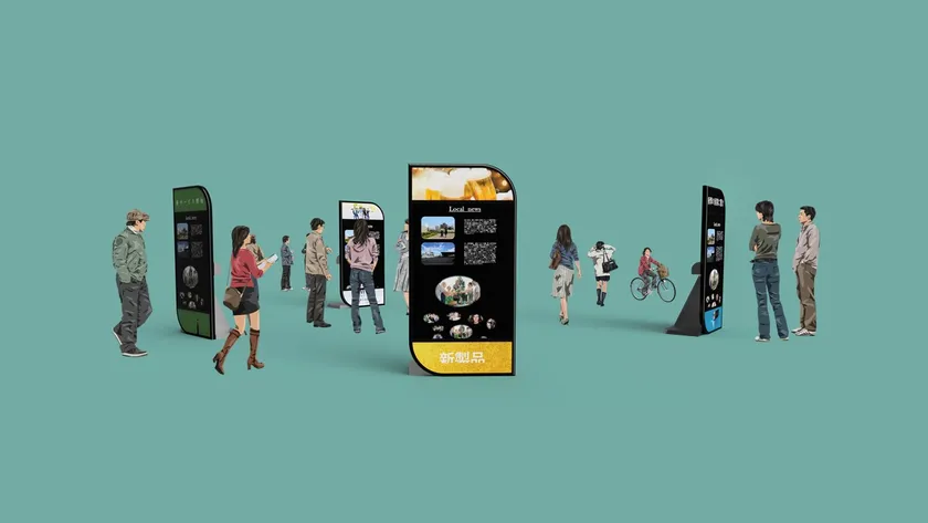 お互いの店舗の広告を流す事で、観光客に対し地域店舗での買い物を仕向け観光客の流出を防止します。また、広告の一部に外部企業や個人の広告 / 作品を流すことで運営費用を獲得します。
