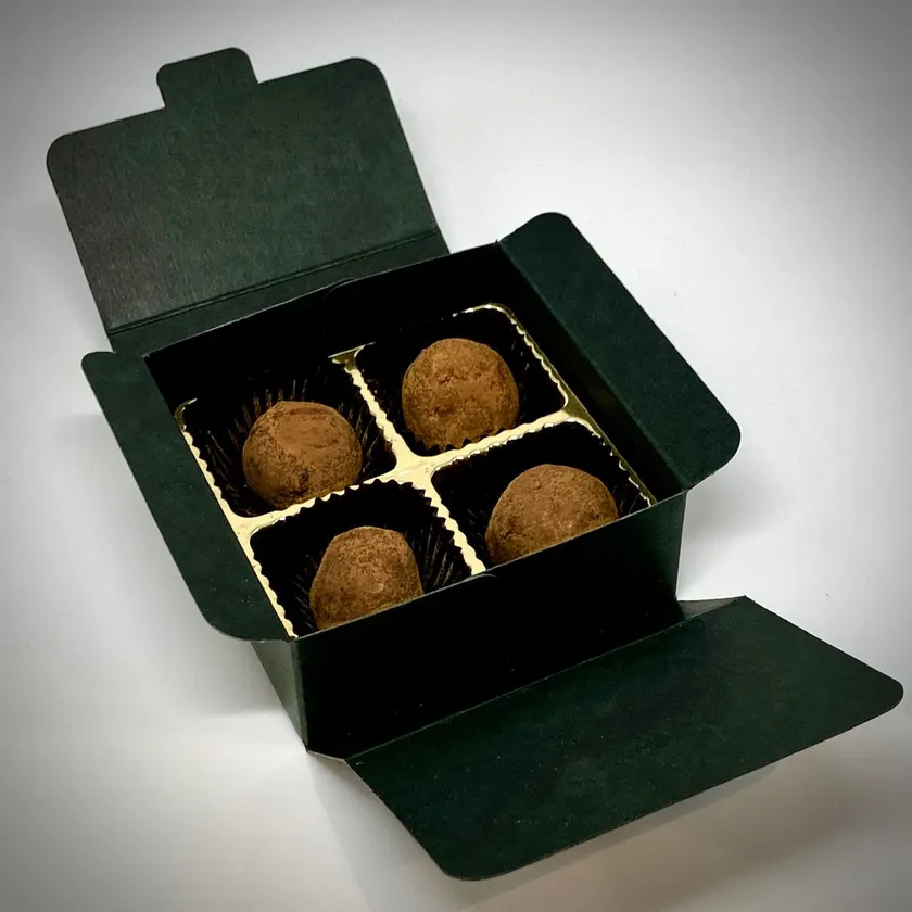 「Chocolats Cafe Genshin」(ショコラ・カフェ玄神)は、チョコレートを、バターミルクキャラメルを混ぜた国産のきな粉生地で包み、カフェ玄神(焙煎有機玄米)のパウダーをまぶして仕上げたものです。