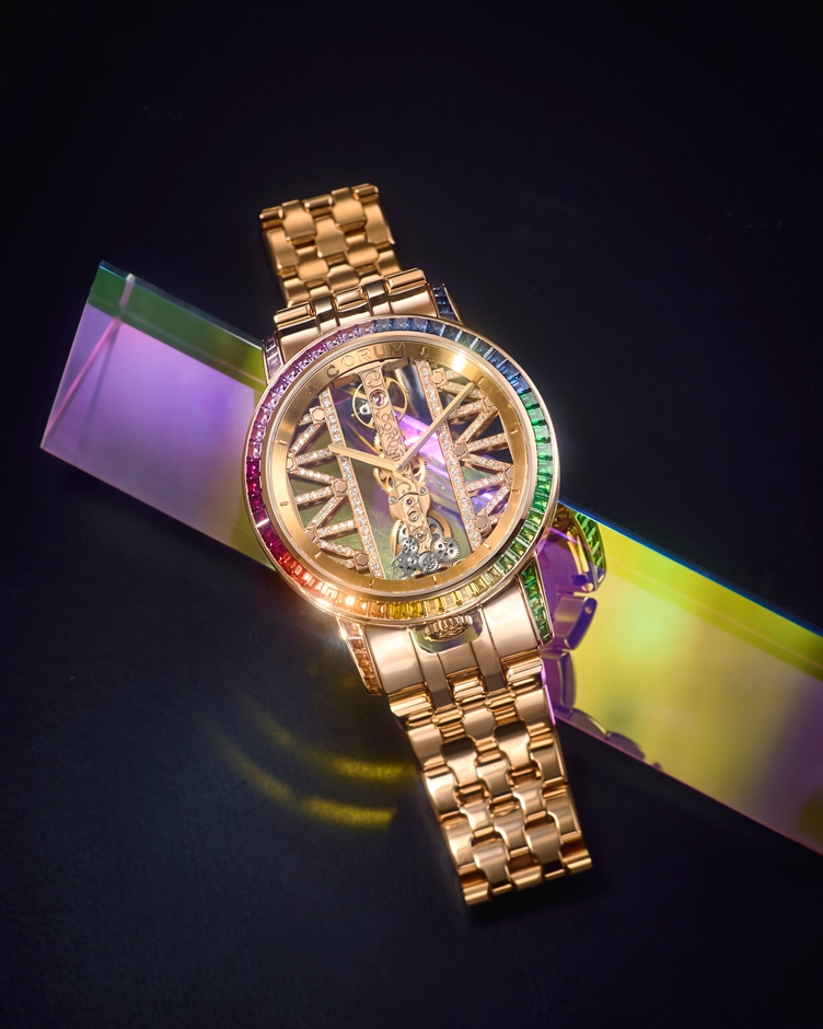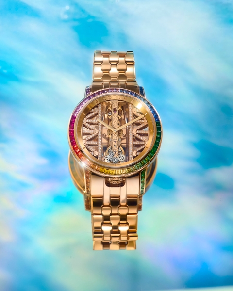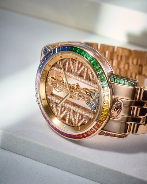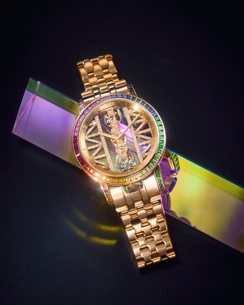 18Kローズゴールドケースに、3種類・計96石のバゲットカットされた宝石をインビジブルセット(ベゼル:52石、ラグ:44石)。3時~5時側のベゼル・ラグに緑色のツァボライトを22石、9時側のベゼルに赤色のルビーを6石、残りの部分に橙・黃・青・紫と色味が異なるサファイアを68石あしらい、それぞれの宝石が幸運の前触れといわれる虹のように輝いています。