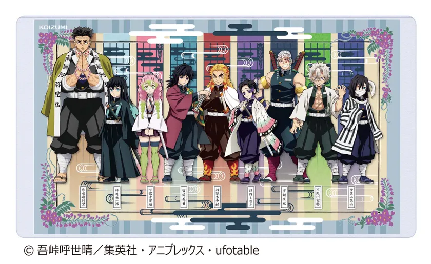 当デスクマットは両面キャラクター紙を挟み込んだ仕様とし、片面は竈門炭治郎(かまどたんじろう)、竈門禰豆子(かまどねずこ)、我妻善逸(あがつまぜんいつ)、嘴平伊之助(はしびらいのすけ)をデザイン。もう一面は柱9人の悲鳴嶼行冥(ひめじまぎょうめい)、時透無一郎(ときとうむいちろう)、甘露寺蜜璃(かんろじみつり)、冨岡義勇(とみおかぎゆう)、煉獄杏寿郎(れんごくきょうじゅろう)、胡蝶しのぶ(こちょうしのぶ)、宇髄天元(うずいてんげん)、不死川実弥(しなずがわさねみ)、伊黒小芭内(いぐろおばない)をデザインしました。