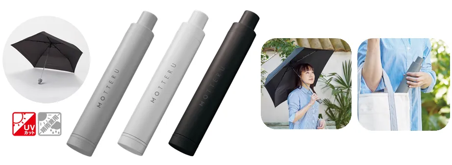 「MOTTERU」は “使い捨てを使わない”という理念のもと、突然の雨にビニール傘を気軽に購入し、使用後は捨ててしまう習慣を断ち切り、地球環境に優しい習慣として、晴雨兼用、重さ190g(約バナナ一本分)の「ITSUMOスリムボトル折りたたみ傘」を毎日携帯することを提案します。