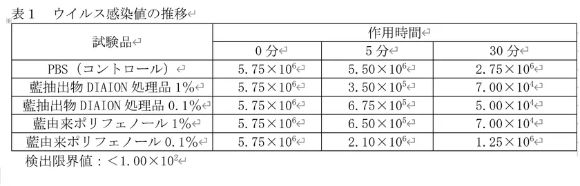 表1~2に示した通り、新型コロナウイルスに対し、30分の接触で95%以上の感染価減少率を示したのは、藍由来ポリフェノール1%で7.00×104PFU/mL(減少率97.454%)、藍抽出物DIAION処理品1%で7.00×104PFU/mL(減少率97.454%)、藍抽出物DIAION処理品0.1%で5.00×104PFU/mL(減少率98.181%)であった。