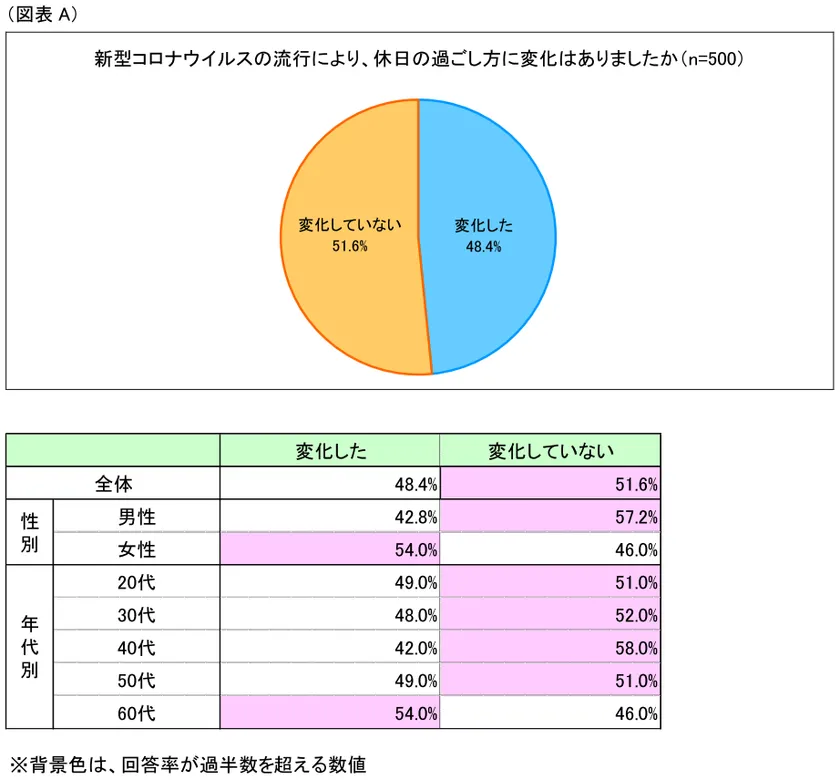 昨今の社会情勢下において休日の過ごし方に変化があったか調査したところ「変化した」(回答率48.4%)と「変化していない」(同51.6%)が半々となり、拮抗する結果となりました。