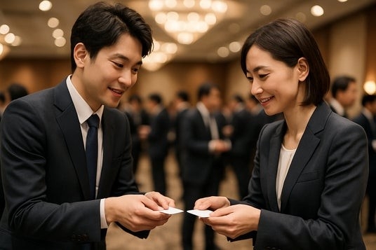 顧問が交流会に参加し、クライアントの会社名刺を用いた交流会での名刺交換