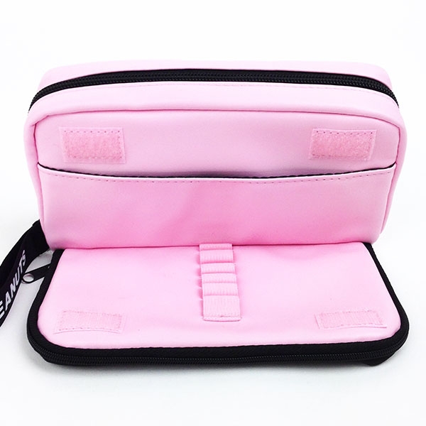 こちらもメッシュポケット付きです♪Wファスナーで機能面も充実のペンポーチは、90×185×65mmサイズです。ブラックにピンクのストラップが目立っています☆