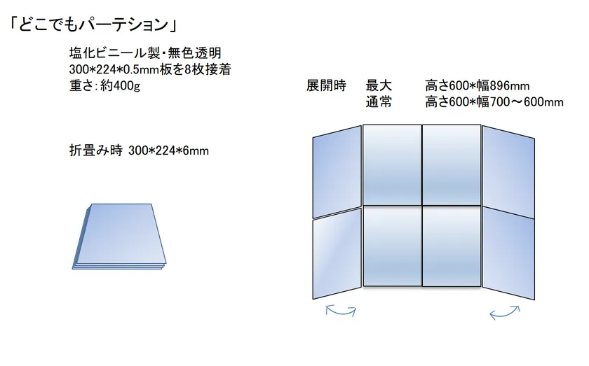 また、食事の際にはどうしてもマスクを外したいという方向けに、鞄での持運びが容易なA4サイズの折畳みパーテーション「どこでもパーテーション」を同時発売します。入ったお店にパーテーションが無いときでも、他人に感染させる不安なく食事を楽しめます。