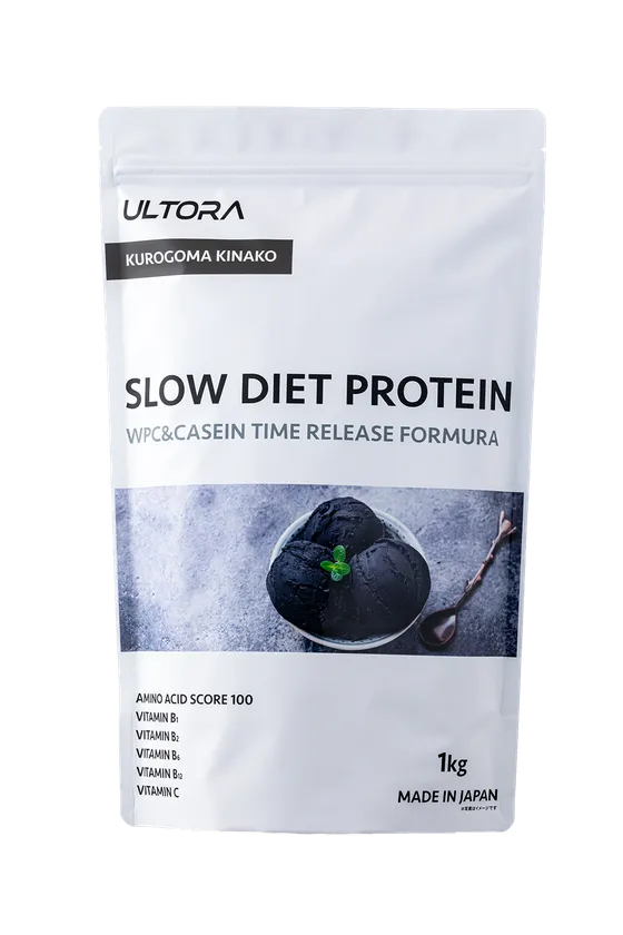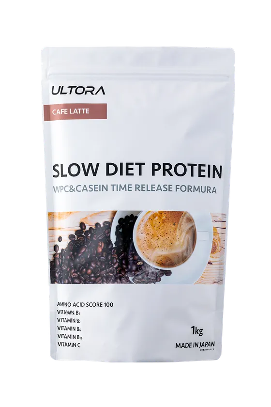また、吸収の早いホエイプロテインと吸収の遅いカゼインプロテインをブレンドし、更に水溶性食物繊維を配合させることにより、日常的なタンパク質補給として飲むのはもちろんのこと、減量中の空腹感を抑制させる効果も期待出来る万能型のタイムリリースプロテイン【ULTORA スローダイエットプロテイン】も発売いたしました。フレーバーは、<黒ゴマきなこ風味><カフェラテ風味><ブルーベリー風味>の3種類です。