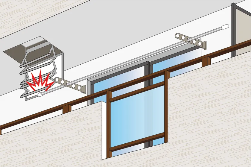 共同住宅に設置されている避難器具用ハッチは、消防庁が定める基準に沿って降下空間を確保する必要があります。しかし、入居者が生活していく中で、物干金物から飛び出る竿が降下空間の妨げになることがあります。竿のとび出しを防ぐため、住民の入居前に設置可能な竿止めを製品化しました。