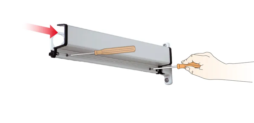 取付けは物干金物に差し込んで、2点ビス止め。たくさんの取付けが必要な場合を想定し、取付け工数を少なく設計しています。