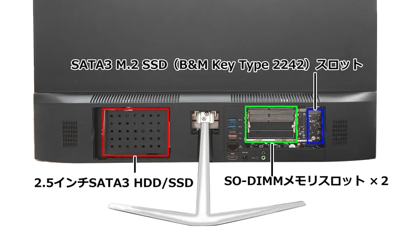搭載ストレージスロットはSATA3 M.2SSD(B&M KeyType2242)×1と2.5インチ SATA3 HDD/SSD×1の計2スロット。