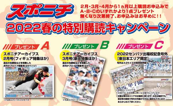 スポーツニッポン新聞社は、2022年1月29日(土)から2022年3月31日(木)まで、「2022春の特別購読キャンペーン」を実施します。