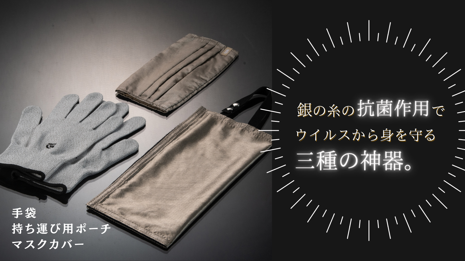 そこで、銀糸で作られた手袋をすることで一度にすべて不安を解決できると考えました。さらに銀糸で作られたマスクカバーやポーチを併用することで大きな効果が期待できます。